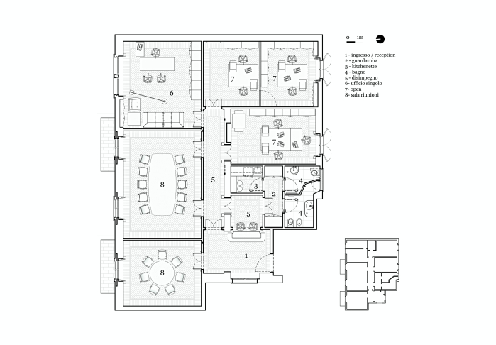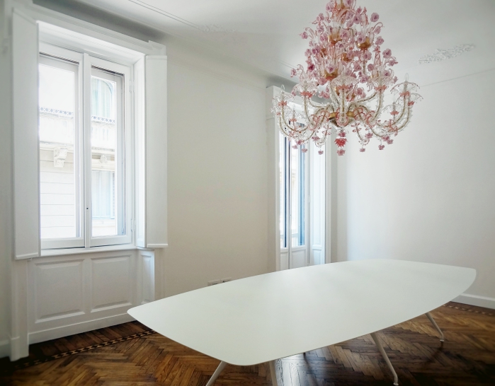 The office stands at the first floor of a building from the turn of the century, in the historical centre of Milan, near the Conservatory. The flat benefits from a triple view. The main rooms are facing the street meanwhile services and operative offices look onto the internal courtyard and the skylight well.